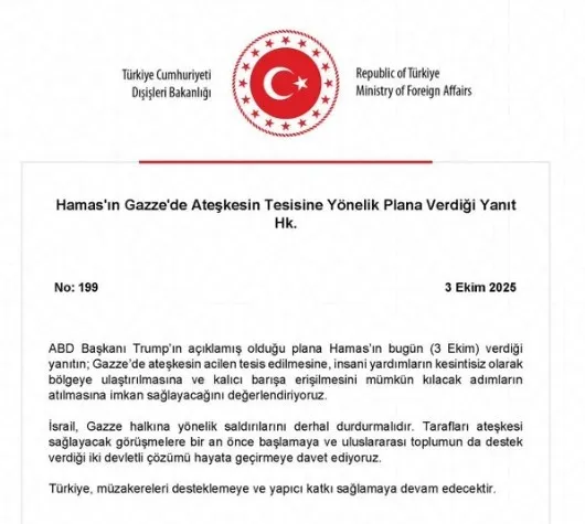 ABD Başkanı Trump’ın açıklamış olduğu plana Hamas’ın bugün (3 Ekim) verdiği yanıtın; Gazze’de ateşkesin acilen tesis edilmesine, insani yardımların kesintisiz olarak bölgeye ulaştırılmasına ve kalıcı barışa erişilmesini mümkün kılacak adımların atılmasına imkan sağlayacağını değerlendiriyoruz.