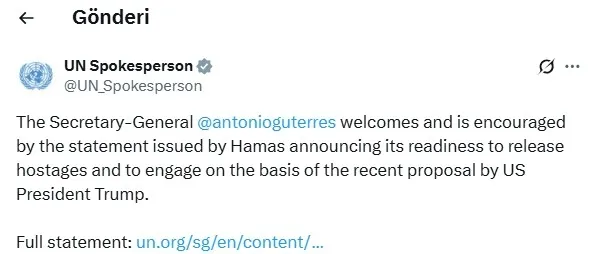 Guterres'in sözcüsü, Hamas'ın Trump'ın Gazze planına verdiği yanıtı memnuniyetle karşıladığını belirtirken, Katar ve Mısır'a arabuluculukları için teşekkür etti.