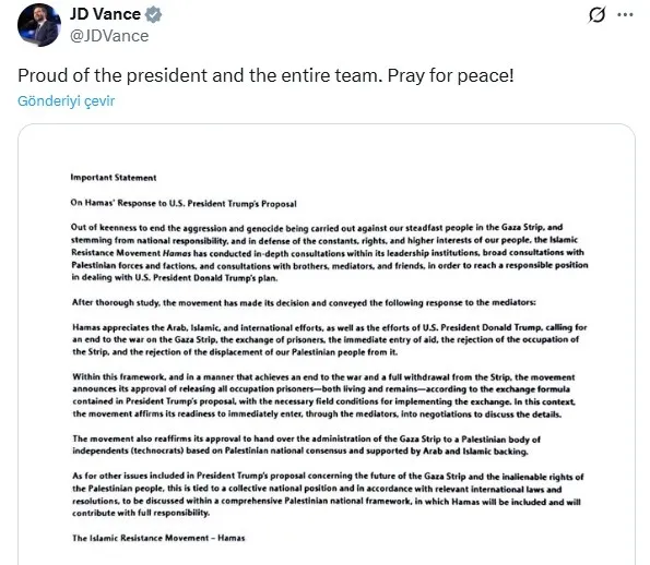 ABD Başkan Yardımcısı JD Vance, Donald Trump’ın Hamas’ın açıklamasını paylaşmasının ardından yaptığı paylaşımla karara destek verdi.