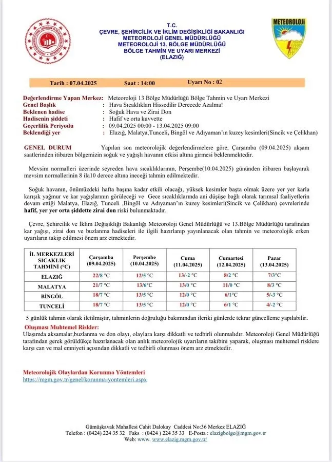 Soğuk havanın, önümüzdeki hafta başına kadar etkili olacağı, yüksek kesimler başta olmak üzere yer yer karla karışık yağmur ve kar yağışlarının görüleceği ve Gece sıcaklıklarında ani düşüşe bağlı olarak tarımsal faaliyetlerin devam ettiği Malatya, Elazığ, Tunceli, Bingöl ve Adıyaman'ın kuzey kesimleri(Sincik ve Çelikhan) çevrelerinde hafif, yer yer orta şiddette zirai don riski bulunmaktadır.