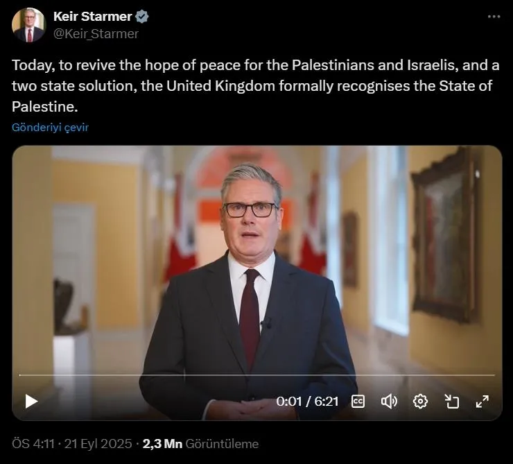 İngiltere Başbakanı Keir Starmer, barış ve iki devletli çözüm umudunu yeniden canlandırmak için Filistin Devleti'ni resmen tanıdıklarını duyurdu.