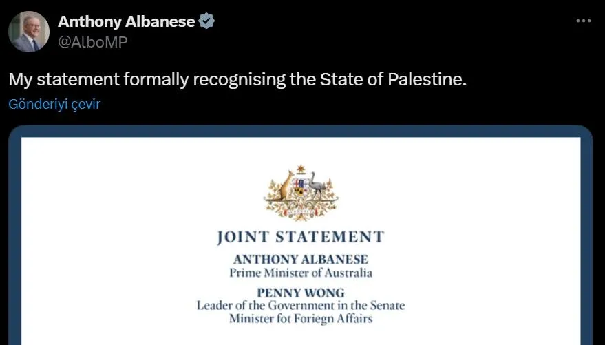 Avustralya Başbakanı Anthony Albanese, Filistin Devleti'ni resmen tanıdıklarını bildirdi. Albanese, ABD merkezli X şirketinin sosyal medya platformundan açıklama yaptı.