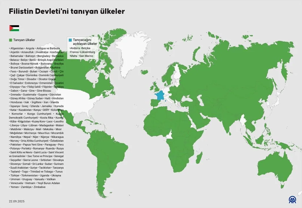 Fransa, İngiltere, Kanada, Avustralya, Belçika, Lüksemburg, Malta, Portekiz, Andorra ve San Marino, New York'ta yapılacak Birleşmiş Milletler (BM) 80. Genel Kurulunda Filistin Devletini tanıdıklarını duyurmaya hazırlanıyor.