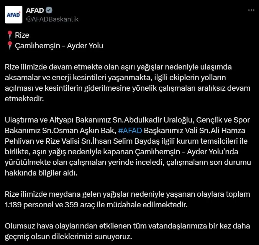 "Sayın Bakanlarımız ve AFAD Başkanımız, Rize Valisi İhsan Selim Baydaş, Milletvekili Harun Mertoğlu, Belediye Başkanı, Rahmi Metin ve ilgili kurum temsilcileri ile birlikte selden etkilenen alanlarda incelemelerde bulundu, çalışmalar hakkında bilgiler aldı. Turuncu uyarı verilen illerimizde meydana gelen yağışlara AFAD, 112 Acil Sağlık, Karayolları, DSİ, İtfaiye, Jandarma, Emniyet, Özel İdare, Belediye ve STK ekipleri toplamda 2 bin 614 personel 984 araçla müdahale etmektedir. Aşırı yağışlar nedeniyle kapanan yolların açılması ve enerji kesintilerinin giderilmesi için ilgili ekiplerin çalışmaları devam etmektedir.