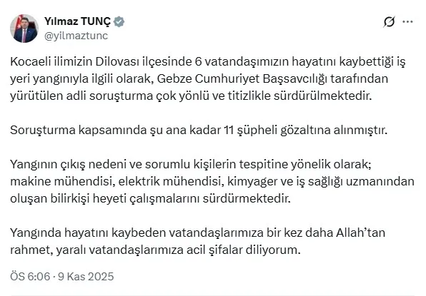 "Yangınla ilgili Gebze Cumhuriyet Başsavcılığımızca adli soruşturma hızlı bir şekilde başlatıldı. Bir Cumhuriyet başsavcıvekili, iki Cumhuriyet savcısı ve bilirkişi heyeti görevlendirildi. Olayda 6 kişinin hayatını kaybettiğini öğrendik. Hayatını kaybeden vatandaşlarımıza Allah'tan rahmet, yakınlarına başsağlığı diliyorum. Bir daha böyle acılar yaşamamamızı temenni ediyorum. Gerekli adli soruşturma tüm yönleriyle titizlikle devam edecektir. Bu konuda sorumluluğu bulunanlarla ilgili gerekli kararlar elbette verilecektir. Tekrar başımız sağ olsun."