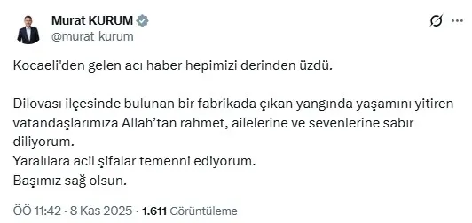 "Kocaeli'den gelen acı haber hepimizi derinden üzdü. Dilovası ilçesinde bulunan bir fabrikada çıkan yangında yaşamını yitiren vatandaşlarımıza Allah’tan rahmet, ailelerine ve sevenlerine sabır diliyorum. Yaralılara acil şifalar temenni ediyorum. Başımız sağ olsun."