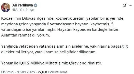 "Dilovası İlçemizde Mimar Sinan Mahallesi'nde bulunan bir kozmetik fabrikasında bugün 09.05'de yangın meydana gelmiştir. Olay mahallinde AFAD, Emniyet, Sağlık ve Kocaeli Büyükşehir Belediyesi İtfaiye ekiplerince müdahele edilen yangın söndürülmüş olup, soğutma çalışmaları ve incelemeler devam etmektedir. Meydana gelen yangında 6 vatandaşımız hayatını kaybetmiş ve 1 vatandaşımız da yaralanmıştır."