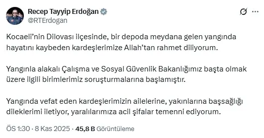 "Kocaeli’nin Dilovası ilçesinde, bir depoda meydana gelen yangında hayatını kaybeden kardeşlerimize Allah’tan rahmet diliyorum. Yangınla alakalı Çalışma ve Sosyal Güvenlik Bakanlığımız başta olmak üzere ilgili birimlerimiz soruşturmalarına başlamıştır. Yangında vefat eden kardeşlerimizin ailelerine, yakınlarına başsağlığı dileklerimi iletiyor, yaralılarımıza acil şifalar temenni ediyorum."