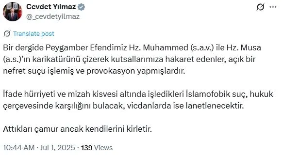 "Bir dergide Peygamber Efendimiz Hz. Muhammed (sav) ile Hz. Musa'nın (as) karikatürünü çizerek kutsallarımıza hakaret edenler, açık bir nefret suçu işlemiş ve provokasyon yapmışlardır. İfade hürriyeti ve mizah kisvesi altında işledikleri İslamofobik suç, hukuk çerçevesinde karşılığını bulacak, vicdanlarda ise lanetlenecektir. Attıkları çamur ancak kendilerini kirletir."