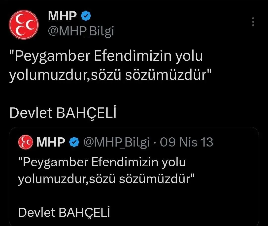 MHP'den skandala tepki gösterdi. Sosyal medyadan yapılan paylaşımda Bahçeli'nin, "Peygamber Efendimizin yolu yolumuzdur, sözü sözümüzdür'' ifadelerine yer verildi.