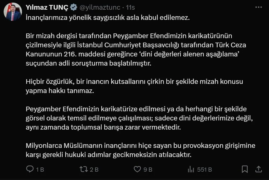 "Bir mizah dergisi tarafından Peygamber Efendimizin karikatürünün çizilmesiyle ilgili İstanbul Cumhuriyet Başsavcılığı tarafından Türk Ceza Kanunu'nun 216. maddesi gereğince 'dini değerleri alenen aşağılama' suçundan adli soruşturma başlatılmıştır. Hiçbir özgürlük, bir inancın kutsallarını çirkin bir şekilde mizah konusu yapma hakkı tanımaz. Peygamber Efendimizin karikatürize edilmesi ya da herhangi bir şekilde görsel olarak temsil edilmeye çalışılması sadece dini değerlerimize değil, aynı zamanda toplumsal barışa zarar vermektedir. Milyonlarca Müslüman'ın inançlarını hiçe sayan bu provokasyon girişimine karşı gerekli hukuki adımlar gecikmeksizin atılacaktır."