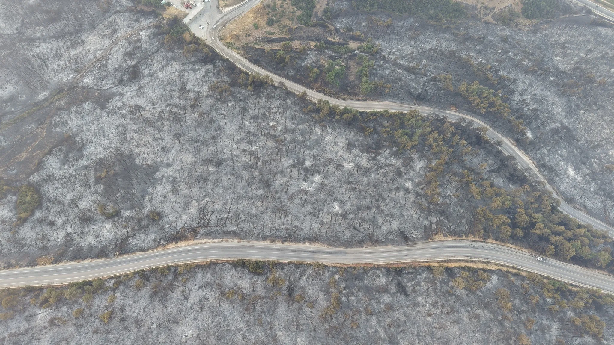 Yangın bölgesi sabah saatlerinde havadan görüntülendi. Geceyi aydınlatan alevler yerini yoğun sis ve dumana bıraktı.