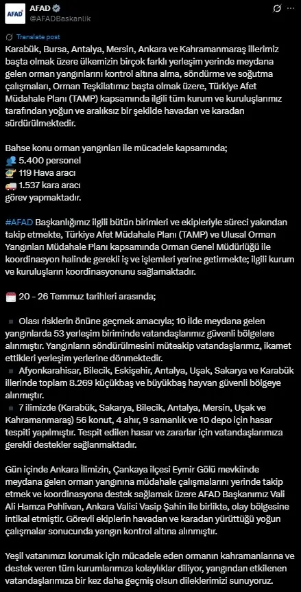 "Bunların dışında gün içinde başlayıp hızlı müdahaleyle söndürülen birçok yangın var. 'Çok riskli' olarak ifade ettiğimiz böyle bir günde, 28'i ormanlık, 48'i kırsal alanda olmak üzere 76 yangınla mücadele ettik. Özetleyecek olursak, Ankara Eymir yangını tamamen kontrol altına alındı, Antalya Gazipaşa, Mersin Silifke ve Antalya Serik yangınları büyük ölçüde kontrol altına alındı. Böylelikle 3 ilimizdeki 4 yangında herhangi sorun kalmadı. Halihazırda devam eden ve bütün gece sürecek olan, umuyorum ki içlerinden birkaçı için güzel haberler vereceğimiz, Karabük Safranbolu, Uşak Sivaslı'daki ikinci yangın, Kahramanmaraş Onikişubat, Bursa Harmancık ve Bursa Kestel yangınları devam ediyor."