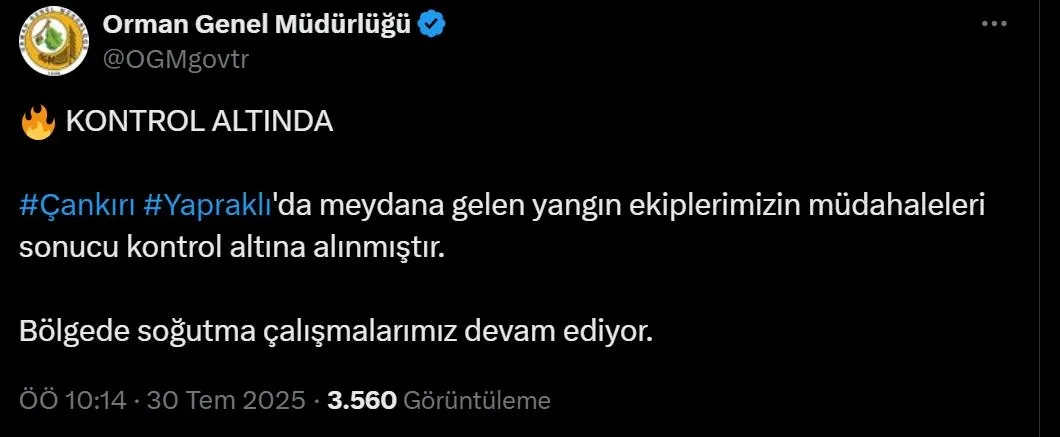 "Çankırı Yapraklı'da meydana gelen yangın ekiplerimizin müdahaleleri sonucu kontrol altına alınmıştır. Bölgede soğutma çalışmalarımız devam ediyor."