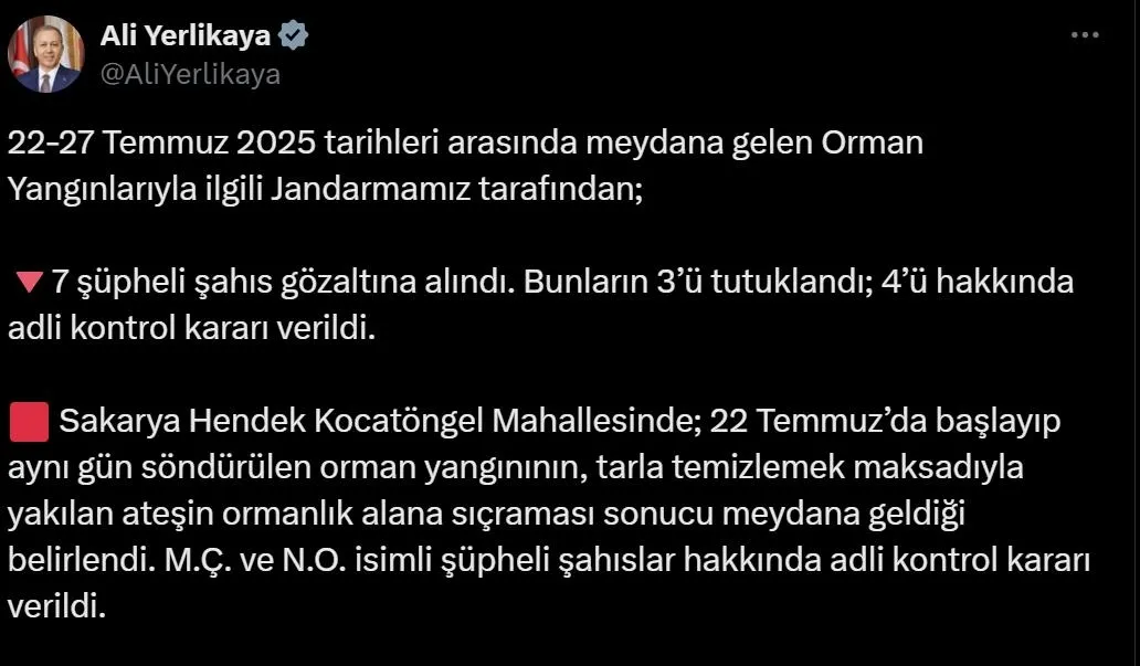 "Basın yayın kuruluşlarında yer alan ’Bursa’da Havai Fişek Yangın Çıkardı’ haberine konu olayla ilgili olarak Cumhuriyet Başsavcılığımızca başlatılan soruşturma kapsamında; Cumhuriyet Başsavcılığımızın talimatı ile Bursa İl Emniyet Müdürlüğü Çarşı Polis Merkezi Amirliği görevlilerince 28.07.2025 tarihinde havai fişek atarak yangına sebebiyet veren şüpheliler S.D., A.K., M.B. ve M.A.’nın yakalanarak gözaltına alındığı, Cumhuriyet Başsavcılığımızca soruşturmanın titizlikle yürütüldüğü, soruşturmanın safahatı ve sonucu hakkında bilgi verileceği hususu, Kamuoyuna saygıyla duyurulur."