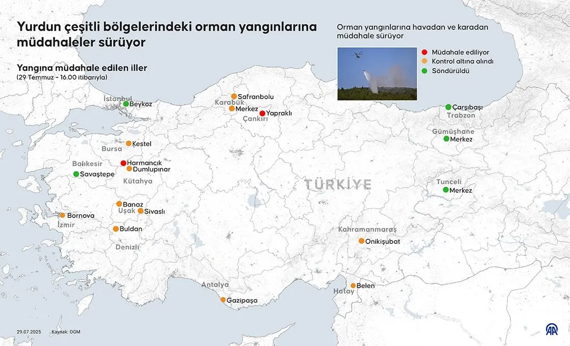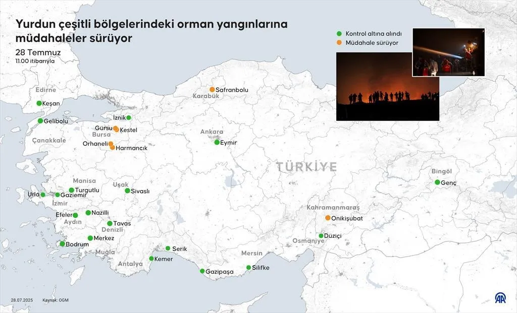 Tarım ve Orman Bakanlığı Orman Genel Müdürlüğü (OGM) verilerine göre, Türkiye genelinde pek çok ilde çıkan orman yangınlarına havadan ve karadan müdahaleler devam ediyor. Yangınların bazıları kontrol altına alınırken, bazı bölgelerde söndürme çalışmaları sürüyor.