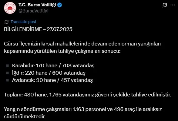 Yangına ilk andan itibaren 4 helikopter, 174 araç ve 481 personelle hızlı ve etkili şekilde müdahale edildiği belirtilen açıklamada, "Güvenlik gerekçesiyle Kahyalar köyü Kabaoğlu ve Çakırlar mahalleleri ile Kaleköy merkez ve Sarıkonak mahalleleri tedbiren tahliye edildi."ifadesi kullanıldı.