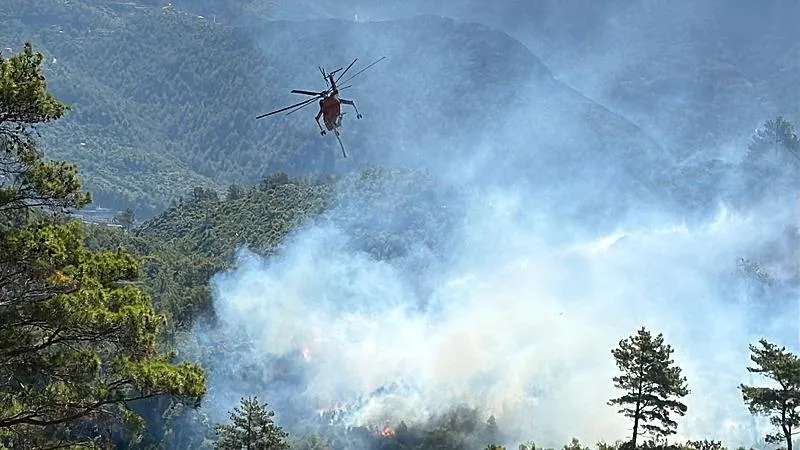 Ekipler, yangını söndürmek için helikopter desteğiyle çalışmalarını sürdürüyor.