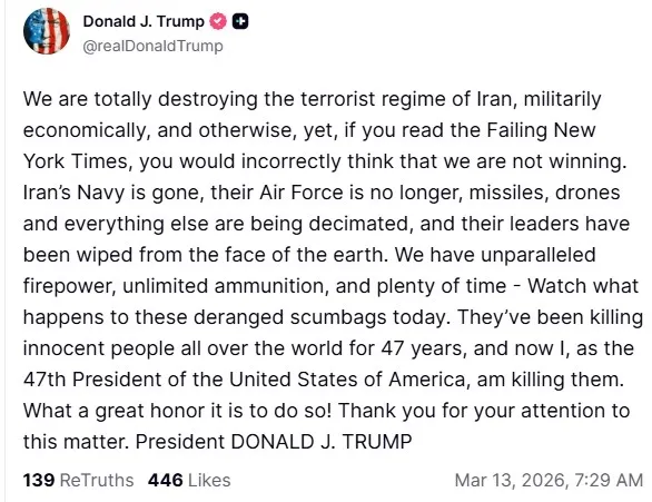 "İran’ın terörist rejimini askeri, ekonomik ve diğer tüm alanlarda tamamen yok ediyoruz. Ancak başarısız New York Times’ı okursanız, yanlış bir şekilde kazanmadığımızı düşünebilirsiniz. İran’ın donanması artık yok, hava kuvvetleri ortadan kalktı; füzeleri, dronları ve diğer her şeyleri imha ediliyor ve liderleri yeryüzünden silindi.