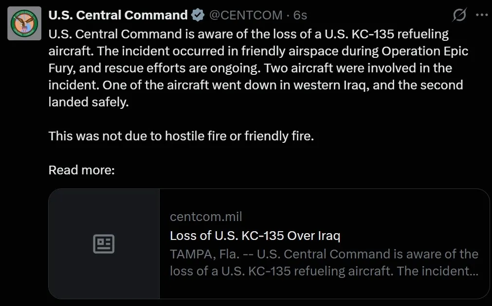 ABD Merkez Kuvvetler Komutanlığı (CENTCOM), ABD Hava Kuvvetleri'ne ait bir KC-135 yakıt ikmal uçağının Irak'ın batısında düştüğünü ve olayın dost hava sahasında meydana geldiğini açıkladı.