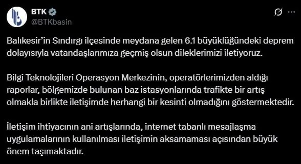 "Balıkesir’in Sındırgı ilçesinde meydana gelen 6.1 büyüklüğündeki deprem dolayısıyla vatandaşlarımıza geçmiş olsun dileklerimizi iletiyoruz. Bilgi Teknolojileri Operasyon Merkezinin, operatörlerimizden aldığı raporlar, bölgemizde bulunan baz istasyonlarında trafikte bir artış olmakla birlikte iletişimde herhangi bir kesinti olmadığını göstermektedir. İletişim ihtiyacının ani artışlarında, internet tabanlı mesajlaşma uygulamalarının kullanılması iletişimin aksamaması açısından büyük önem taşımaktadır." ifadelerini kullandı.