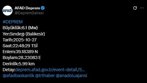 Afet ve Acil Durum Yönetimi Başkanlığının (AFAD) internet sitesinde yer alan bilgiye göre, Balıkesir'in Sındırgı ilçesinde 6.1 büyüklüğünde deprem meydana geldi.