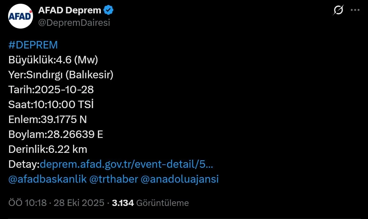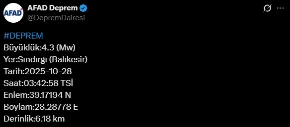 "Balıkesir Sındırgı’da meydana gelen 6.1 büyüklüğündeki depremin ardından saha ekiplerimizin ve ilgili birimlerin tespit çalışmaları devam etmektedir. İstanbul’umuzda şu ana kadar herhangi bir hasar ihbarı alınmamış olup, ilgili birimlerimiz çalışmalarına gece boyunca devam edecektir. Tüm vatandaşlarımıza geçmiş olsun dileklerimizi iletiyoruz. Allah, ülkemizi ve milletimizi her türlü afetten korusun."
