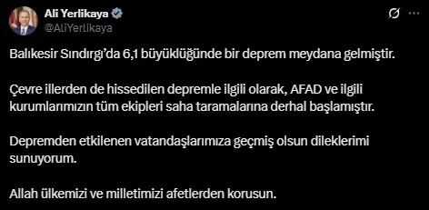 Yerlikaya, sosyal medya hesabından yaptığı açıklamada, Balıkesir Sındırgı'da 6,1 büyüklüğünde bir deprem meydana geldiğini belirtti.