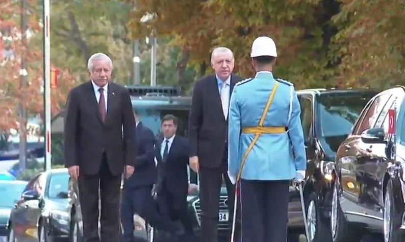 TBMM Başkanı Numan Kurtulmuş, Cumhurbaşkanlığı Onur Kıtası'nı selamlayan Başkan Erdoğan'ı Şeref Kapısı önünde karşıladı.