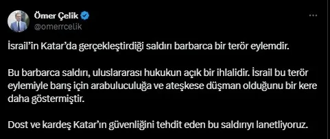 AK Parti Genel Başkan Yardımcısı ve Parti Sözcüsü Ömer Çelik, "İsrail'in Katar'da gerçekleştirdiği saldırı barbarca bir terör eylemidir. Bu barbarca saldırı, uluslararası hukukun açık bir ihlalidir." ifadelerini kullandı.