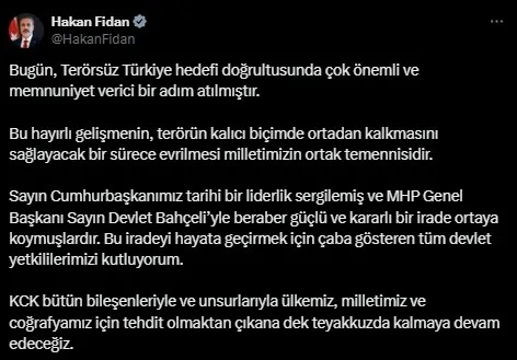 Dışişleri Bakanı Hakan Fidan sosyal medya hesabından, "Bugün, Terörsüz Türkiye hedefi doğrultusunda çok önemli ve memnuniyet verici bir adım atılmıştır. Bu hayırlı gelişmenin, terörün kalıcı biçimde ortadan kalkmasını sağlayacak bir sürece evrilmesi milletimizin ortak temennisidir.