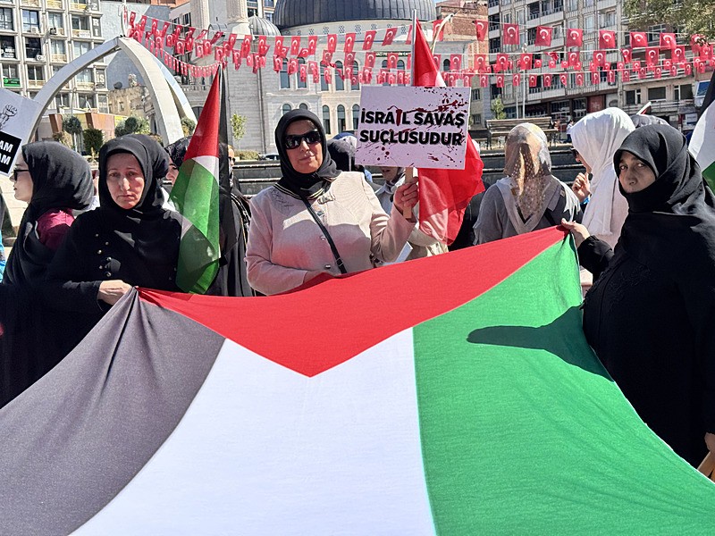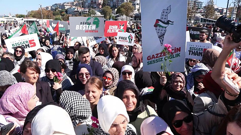 "Gazze, bu ilahi kelamın sarsıcı bir imtihanıdır. Bizler İstanbul'dan, Hakkari'den, Trabzon'dan, Erzurum'dan ve Türkiye'nin 81 ilinden dünyanın dört bir yanındaki kadınlara, kız kardeşlerimize sesleniyoruz. Barış kadınla mümkün. Barışcıl bir şekilde yola çıkan ve uluslararası sularda haydut İsrail'in hukuksuz müdahalesine uğrayan Küresel Sumud Filosu’nu dünya öylece seyretti. Hamdolsun, Türkiye, Cumhurbaşkanımız Recep Tayyip Erdoğan'ın kararlılığıyla bu adaletsizlik karşısında da sessiz kalmadı. Sadece kendi ülkesinin vatandaşlarını değil, 13 ülkeden 101 vicdan sahibi gönüllünün de ülkelerine güvenle dönmelerini sağladı. Bizler de ablukayı delmek ve insanlık onurunu korumak için mücadele eden kahramanların ülkemize dönüşlerinde oradaydık. Hepsinin dilinde aynı temenni vardı. Biz elimizden geleni yaptık, umarım Gazze'ye bir umut ışığı olabilmişizdir. İşte bugün o umut sözleri de bu meydanda yankılanıyor. Nehirden denize özgür Filistin. Sevgili dostlar, biz bugün bütün kimliklerimizden sıyrılarak; sadece kadın kimliğimizle buradayız. Çünkü bu mesele ne dünyadaki rollerimizle ne taşıdığımız ünvanlarla ne de sahip olduklarımızla ilgilidir. Bu mesele insanlık meselesidir. Bugün Türkiye'den tüm dünyaya tek bir şey söylüyoruz. Barış kadınla mümkündür. Slogan atmıyoruz, vicdanlarımızla haykırıyoruz. Çünkü bazı sessizlikler vardır ki arşı yere indirir. Ve bizim sessizliğimiz, Gazze'nin en gür çığlığı olacaktır. Ve şimdi sizleri de sessiz çığlık zincirimize davet ediyorum.”
