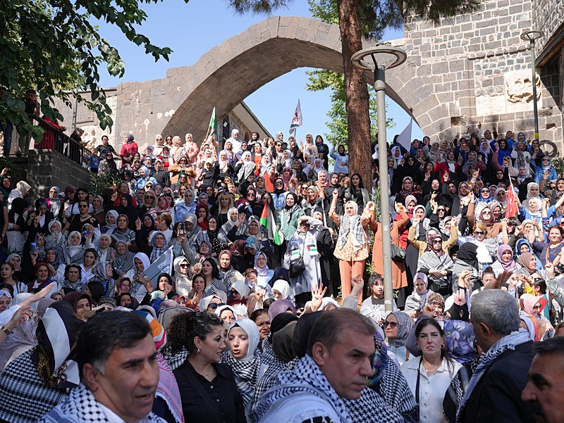 Diyarbakır'da, AK Parti İl Kadın Kolları Başkanlığınca merkez Sur ilçesindeki tarihi İçkale'de düzenlenen etkinliğe katılan kadınlar, "Özgür Gazze", "İsrail savaş suçlusudur" ve "Free Gaza" yazılı pankartları taşıdı, İsrail'in Gazze ve Küresel Sumud Filosu'na yönelik saldırılarına tepki gösterdi.