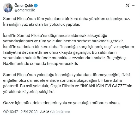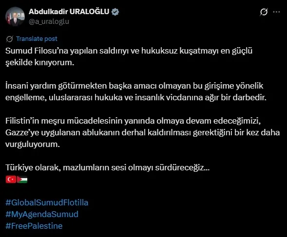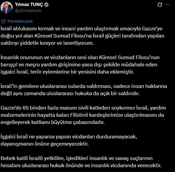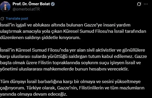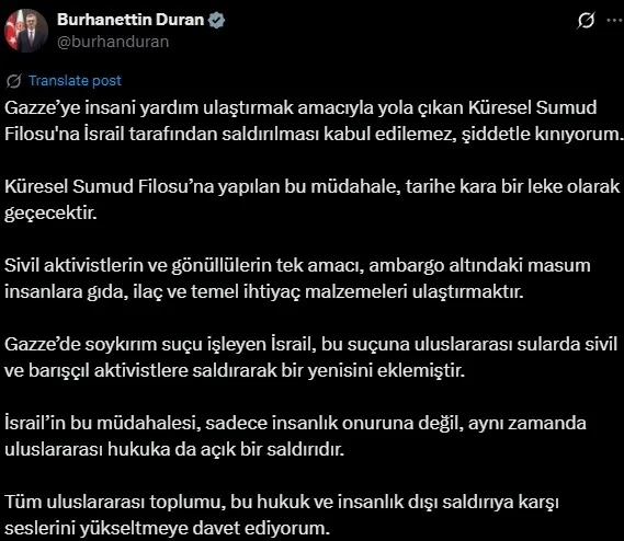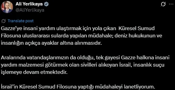 "İsrail'in Küresel Sumud Filosu'nda yer alan sivil aktivistler ve gönüllülere karşı uluslararası sularda yürüttüğü saldırgan tutum kabul edilemez. Gazze başta olmak üzere Filistin topraklarında soykırım suçu işleyen İsrail ve yönetimi uluslararası mahkemelerde bunun hesabını verecektir.Tüm dünyayı İsrail barbarlığına karşı bir olmaya ve sesini yükseltmeye çağırıyorum. Türkiye olarak, Gazze'nin, Filistinlilerin ve tüm mazlumların yanında olmaya devam edeceğiz."