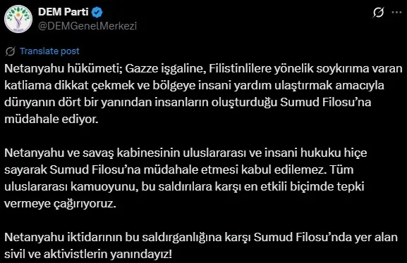 Dem Parti, İsrail'in Küresel Sumud Filosu'na yönelik yaptığı tacizlere yönelik sosyal medya hesabından paylaşımda bulundu.