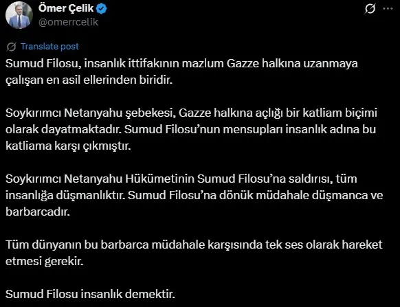 "Cumhurbaşkanımız Sayın Recep Tayyip Erdoğan’ın önderliğinde Türkiye, her daim zalimin karşısında; mazlum Filistin halkının yanında olmaya devam edecektir. Sumud Filosu’na yönelik alçakça saldırı; insanlığa, uluslararası hukuka ve vicdana karşı işlenen bir suçtur. Terör devleti İsrail'in sivilleri hedef almasını en güçlü şekilde lanetliyor, bu onurlu yolculuğa çıkan gönüllü kahramanlarımızı tüm kalbimle selamlıyorum. Dualarımız sizlerle."