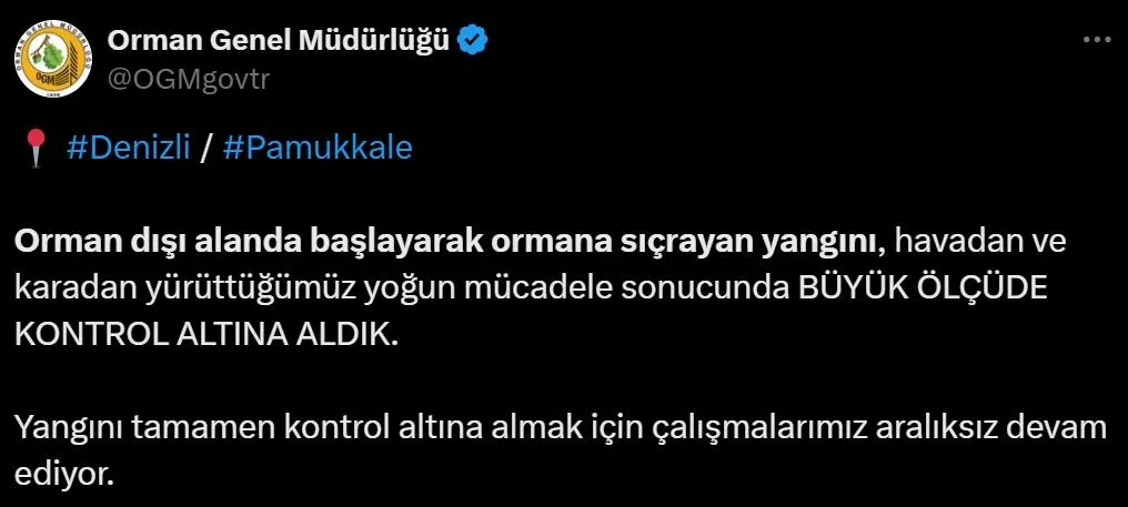 OGM, alevlerin büyük ölçüde kontrol altına alındığı duyurdu.