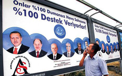 19 Temmuz'da başlayacak olan sigara yasağına, siyasilerden tam destek geldi. Bunun için, AK Parti Genel Başkanı ve Başbakan Recep Tayyip Erdoğan, Sağlık Bakanı Recep Akdağ, MHP Genel Başkanı Devlet Bahçeli, DTP Genel Başkanı Ahmet Türk, DSP Genel Başkanı Masum Türker ve merhum BBP Lideri Muhsin Yazıcıoğlu'nun fotoğraflarının yeraldığı afişler hazırlandı. Bu arada afişlerde CHP lideri Deniz Baykal bulunmuyor.