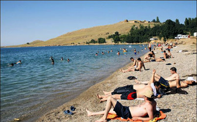 Van Gölü, tatilcilerin akın ettiği Ege ve Akdeniz sahillerine adeta taş çıkartıyor. Hava sıcaklığının 38 dereceyi bulduğu bölgede, sıcaktan bunalan vatandaşlar göle akın etti. Plaja çevrilen gölde, genç yaşlı herkes hem suya girip serinlemenin hem de güneşlenmenin keyfini sürüyor.