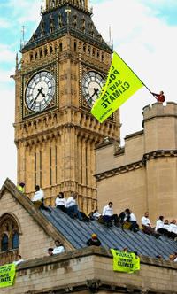 Greenpeace (Yeşil Barış) örgütü mensupları, iklim değişimine dikkati çekmek için Britanya parlamento binasına tırmandılar.