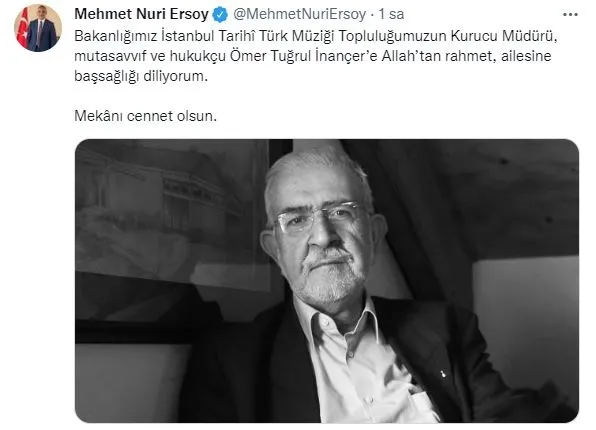 Bakan Ersoy, sosyal medya hesabından yaptığı paylaşımda, "Bakanlığımız İstanbul Tarihi Türk Müziği Topluluğumuzun Kurucu Müdürü, mutasavvıf ve hukukçu Ömer Tuğrul İnançer'e, Allah'tan rahmet, ailesine başsağlığı diliyorum. Mekanı cennet olsun." ifadelerine yer verdi.