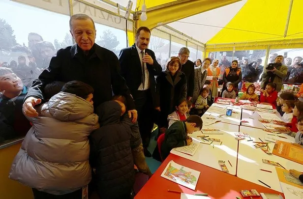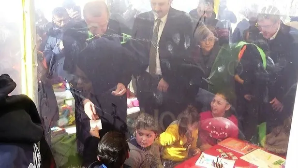 Başkan Erdoğan, girdiği çadırda bulunan ve psikolojik destek verilen minik öğrencilere harçlık verdi. Minik öğrenciler ise hep birlikte şarkı söyleyerek, Erdoğan dedelerine teşekkür etti.