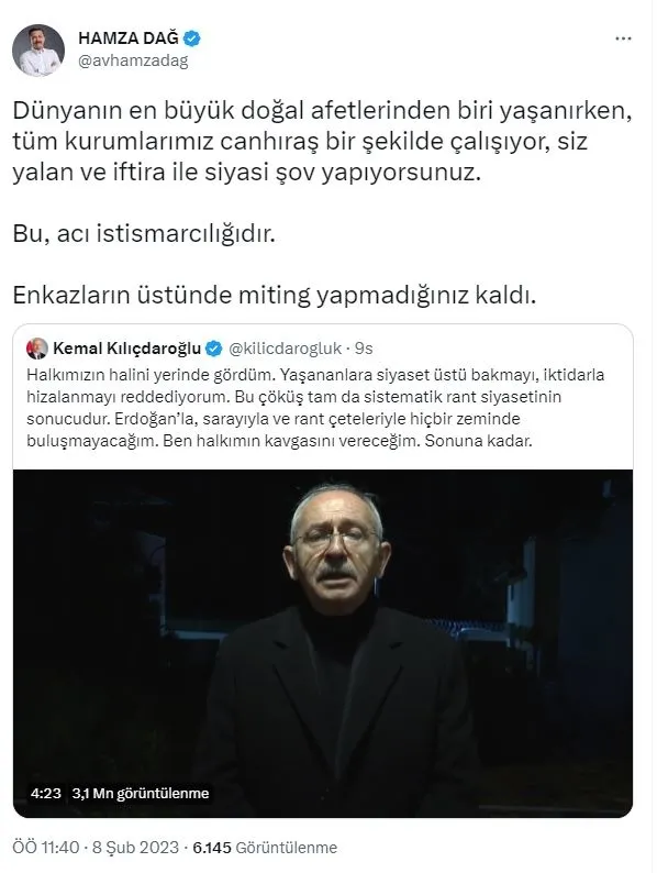 Hamza Dağ, "Tek derdiniz siyasi rant devşirmek! Vicdanınız, merhametiniz kalmamış; kalbiniz kararmış." ifadelerini kullandı.
