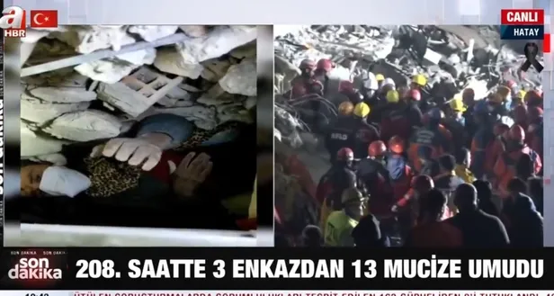 Enkazın 208. saatinde Hatay'da bir vatandaş enkazın altından hayata el salladı. İçeride 4 kişilik bir aile olduğu tahmin edilirken yer altı görüntüleme cihazı ile yer tespit edilirken kurtarma çalışmaları hız kazandı.