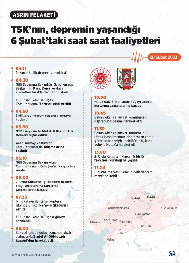 "Merkez üssü Kahramanmaraş'ın Pazarcık ilçesi olan ilk deprem saat 04.17'de gerçekleşti. Milli Savunma Bakanlığının yanı sıra Genelkurmay, Kara, Deniz ve Hava Kuvvetlerinin harekat merkezleri süratle yapılması gerekenleri yaparak saat 04.30'da birliklerden rapor istedi. Aynı saatte Türk Silahlı Kuvvetleri İnsani Yardım Tugay Komutanlığına 'hazır ol' emri verildi.