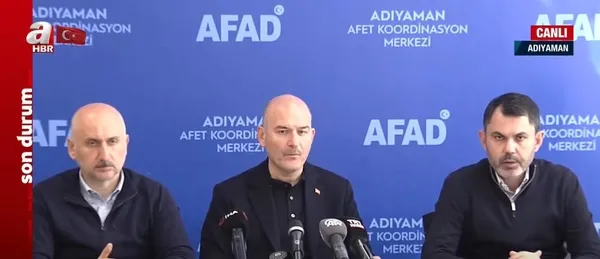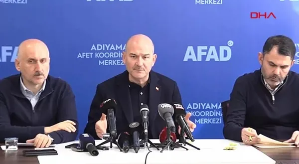 İçişleri Bakanı Süleyman Soylu, Çevre, Şehircilik ve İklim Değişikliği Bakanı Murat Kurum, Ulaştırma ve Altyapı Bakanı Adil Karaismailoğlu, Adıyaman’da deprem ile ilgili açıklama yaptı. Bakan Soylu "İlk günden bu yana güvenlik problemi yaşanmadı" ifadelerini kullandı. Çevre Şehircilik ve İklim Değişimliği Bakanı Murat Kurum ise, "Cumhurbaşkanımızın açıkladığı 200 bin konut projesini bilim insanlarımızla çalışmalarımızı yürütüyoruz. Depremin ardından 18. gün itibariyle 3 günde 7 bin 222 konut ve 36 dükkanın konut sözleşmesini gerçekleştirerek Cumhuriyet tarihinin en büyük afet konut seferberliğini yürütüyoruz" dedi. Ulaştırma ve Altyapı Bakanı Adil Karaismailoğlu ise "Hasar tespit çalışmalarımız yüzde 83 seviyesine geldi. Burada bu düzeni oturtana kadar elimizi buradan çekmeyeceğiz" şeklinde konuştu.