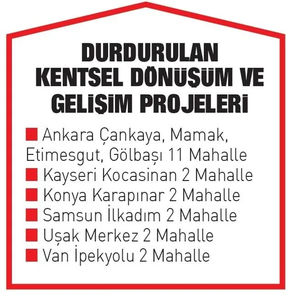 Engellenen projeler ve riskli alanlar arasında, asrın felaketinin yaşandığı Adana, Diyarbakır, Hatay ve Malatya'daki riskli alan kararları ile İstanbul'un 9 ilçesindeki 48 mahalledeki dönüşüm projeleri de yer aldı.
