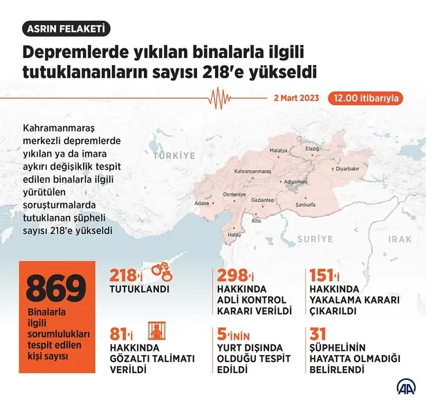 Kahramanmaraş merkezli depremlerde yıkılan ya da imara aykırı değişiklik tespit edilen binalarla ilgili yürütülen soruşturmalarda tutuklanan şüpheli sayısı 218'e yükseldi.
