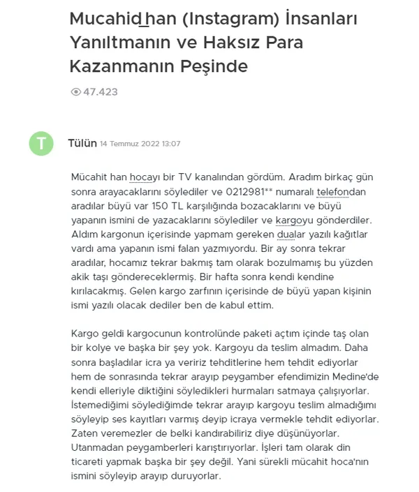 İnternet Mücahit Han ile ilgili sayfalarca şikayetle dolu. Okuyunca insan neye isyan edeceğini şaşırıyor. Sözün bittiği yer dedirten şikayetlerden bazıları ise şöyle: