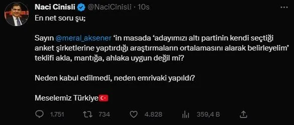 İYİ Parti Erzurum Milletvekili Naci Cinisli: "En net soru şu; Sayın Meral Akşener'in masada 'adayımızı altı partinin kendi seçtiği anket şirketlerine yaptırdığı araştırmaların ortalamasını alarak belirleyelim' teklifi akla, mantığa, ahlaka uygun değil mi? Neden kabul edilmedi, neden emrivaki yapıldı?"